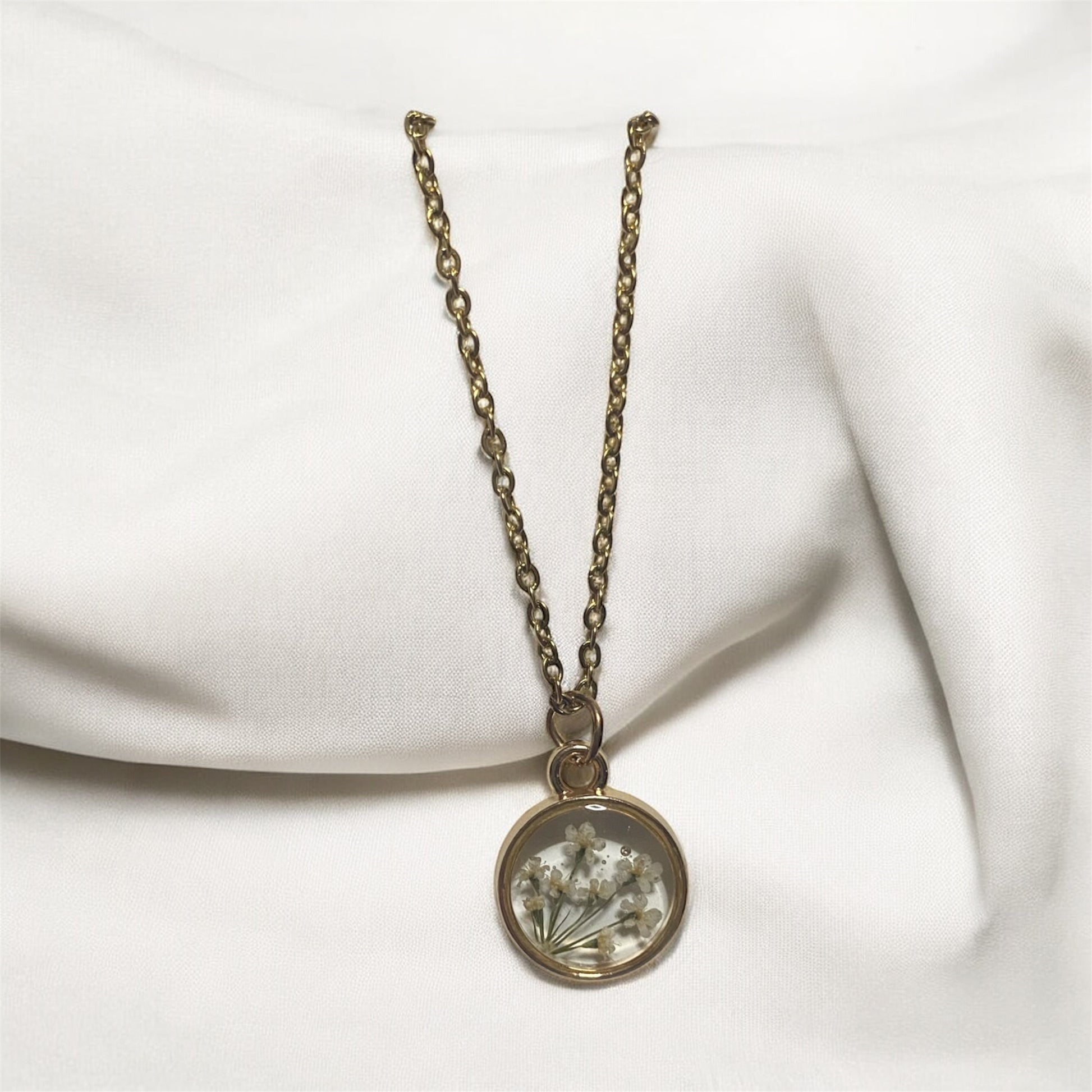 Dainty Rose Gold Bezel with Queen Anne’s Lace on a Brass chain