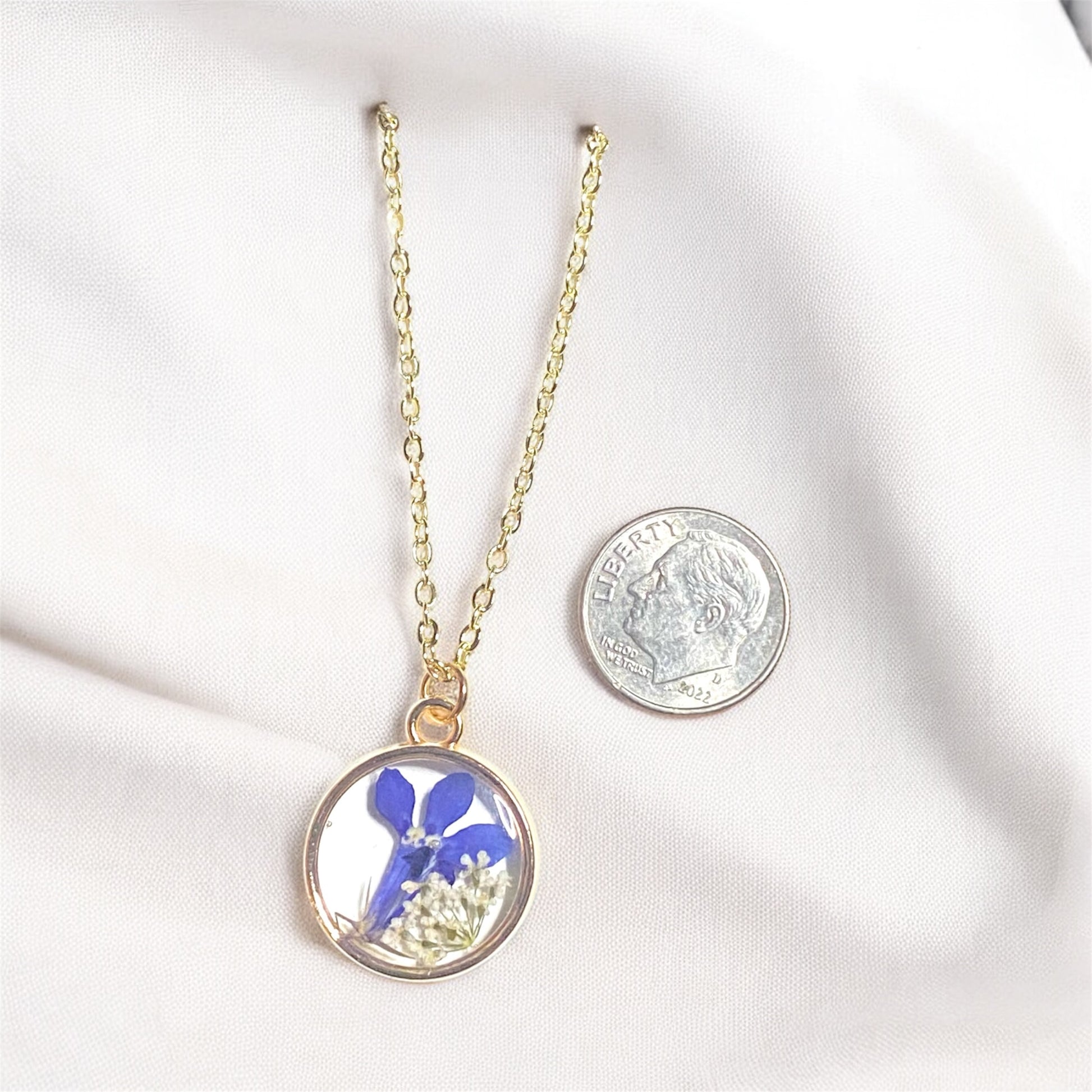 This is a handmade necklace made with real dry pressed flowers. The bezel is made of rose gold colored alloy and comes on a gold plated brass chain. Each piece of jewelry is unique and hand made.