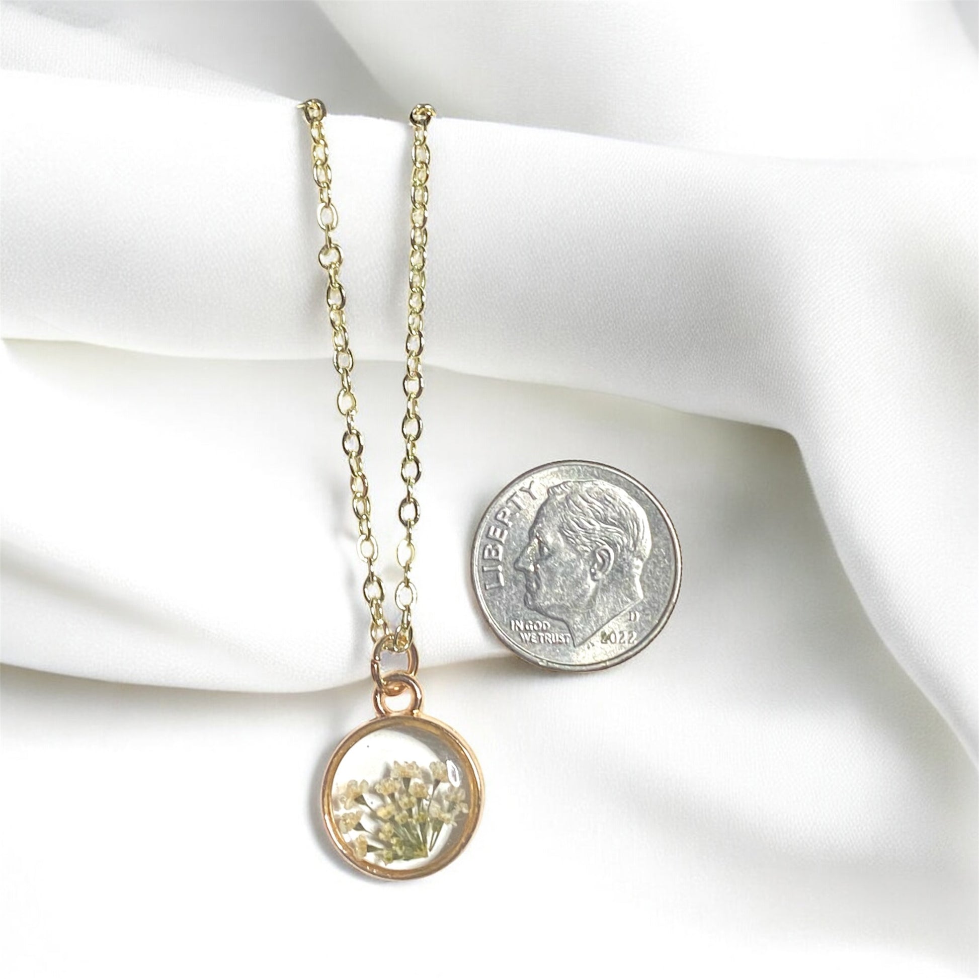 Dainty Rose Gold Bezel with Queen Anne’s Lace on a Brass Chain