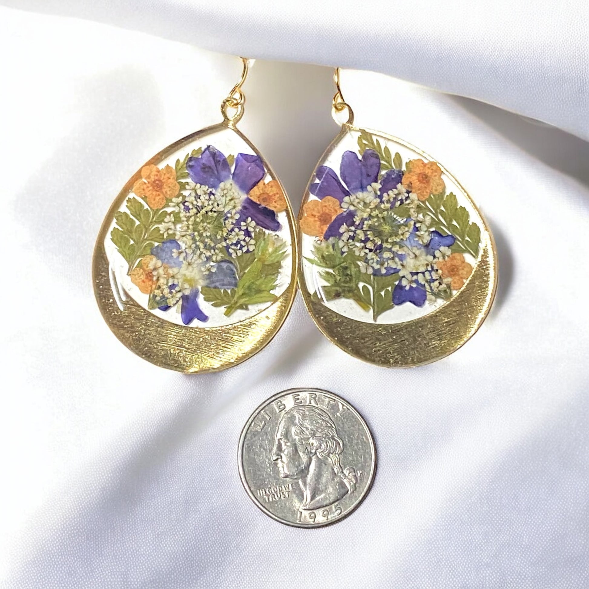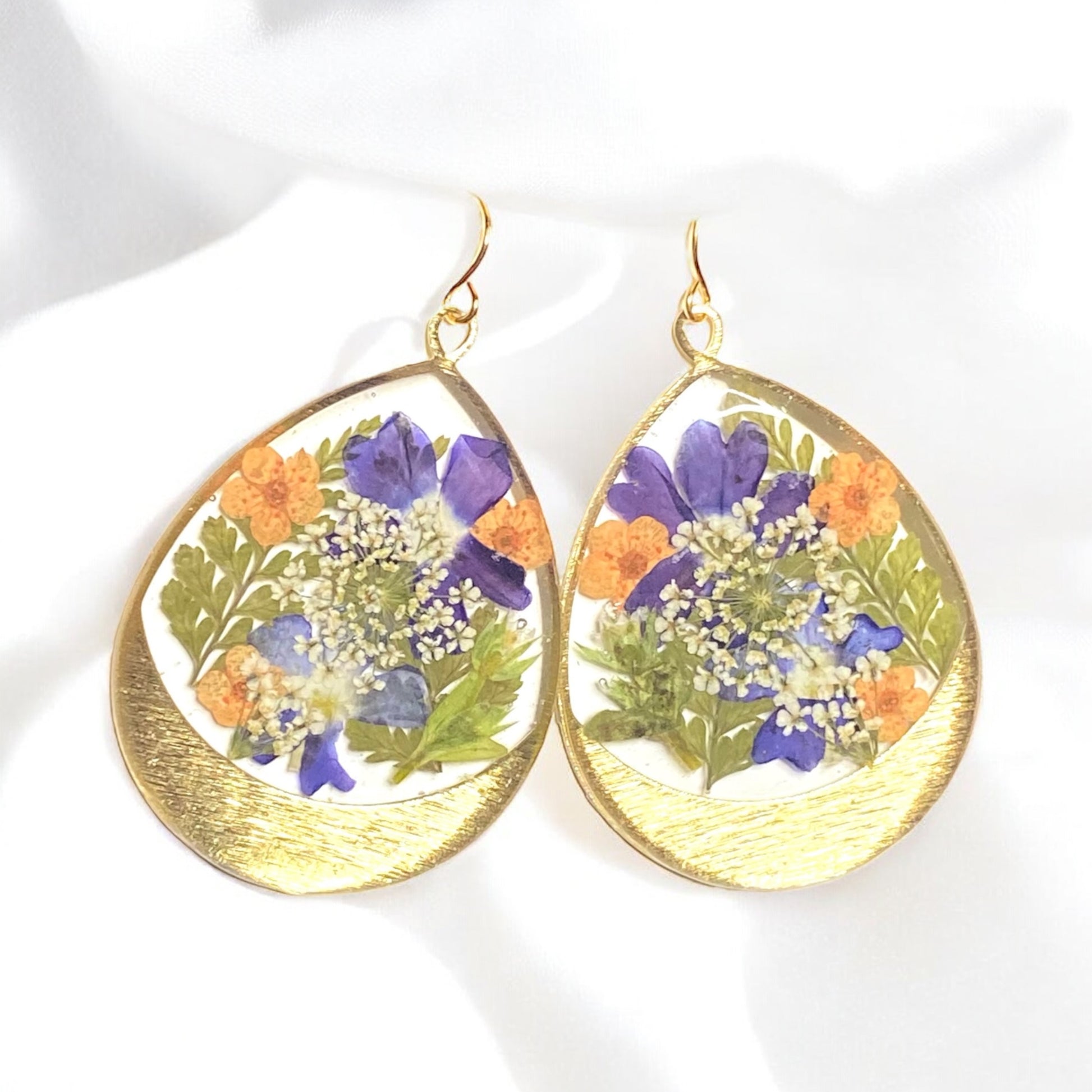 These are handmade earrings that are beautiful and unique. Made with real flowers. Earring hooks are made of gold plated stainless steel