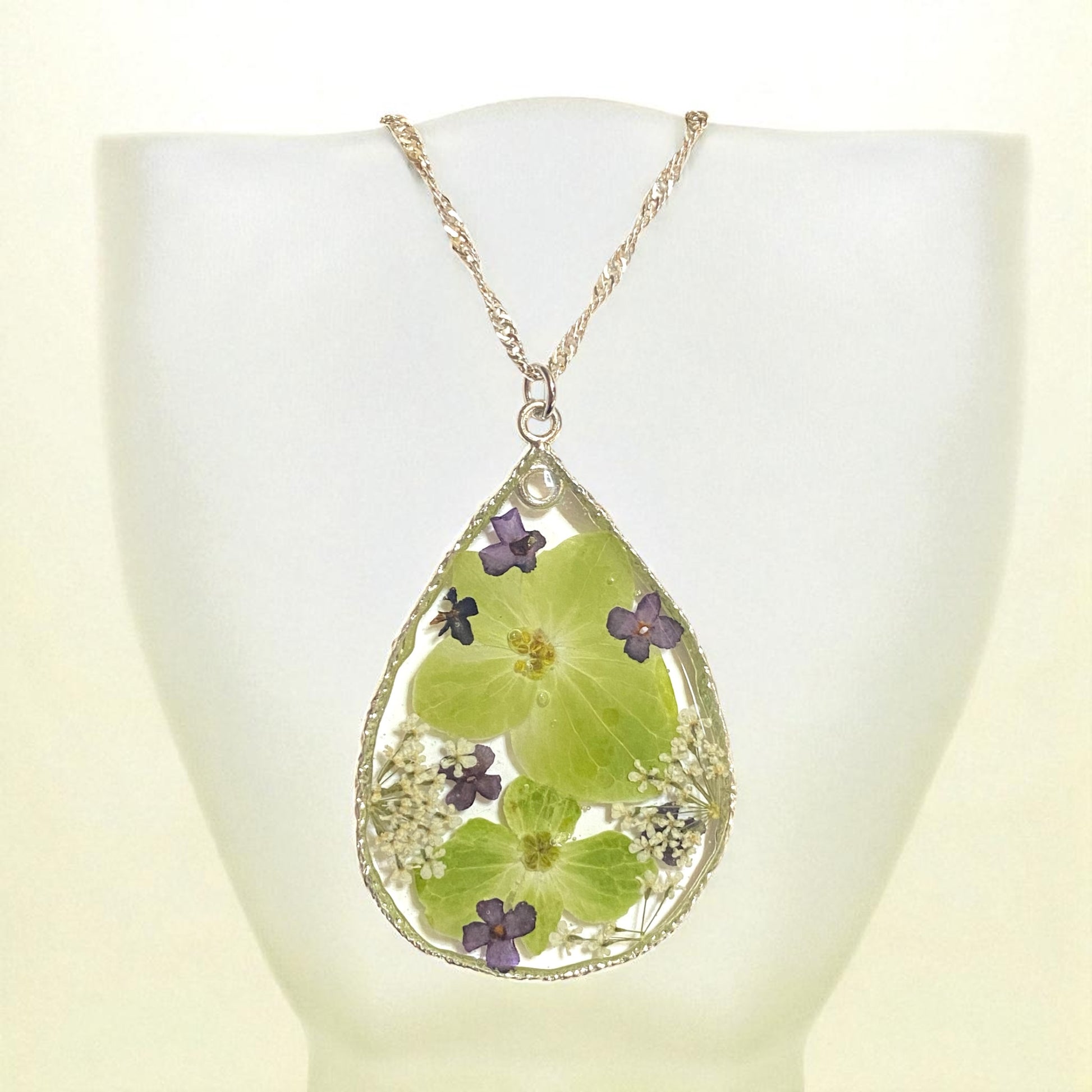 This is a handmade necklace made with real dry pressed flowers. The bezel is made of silver colored alloy. The bezel is attached to a 925 sterling silver chain. Each piece of jewelry is unique and hand made.