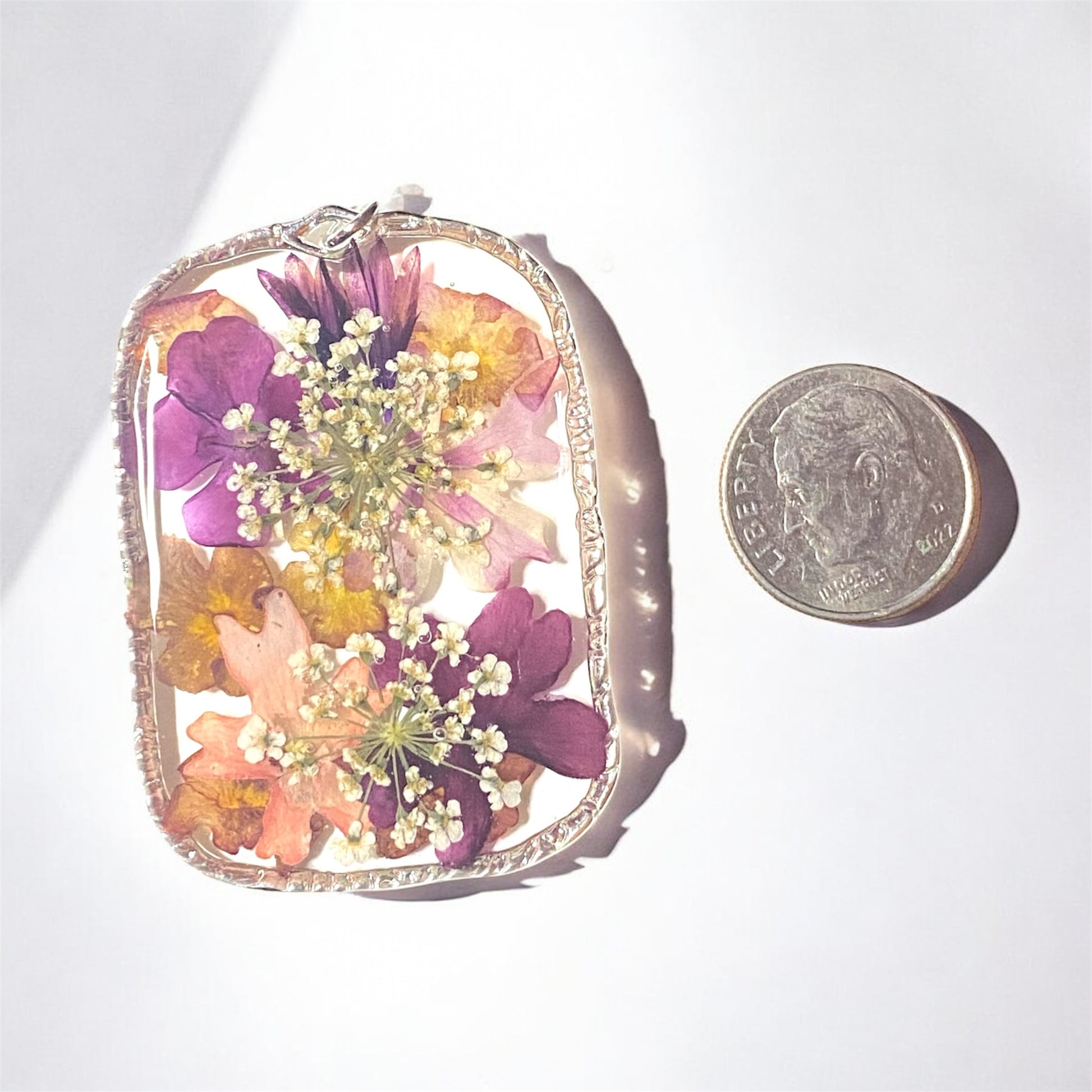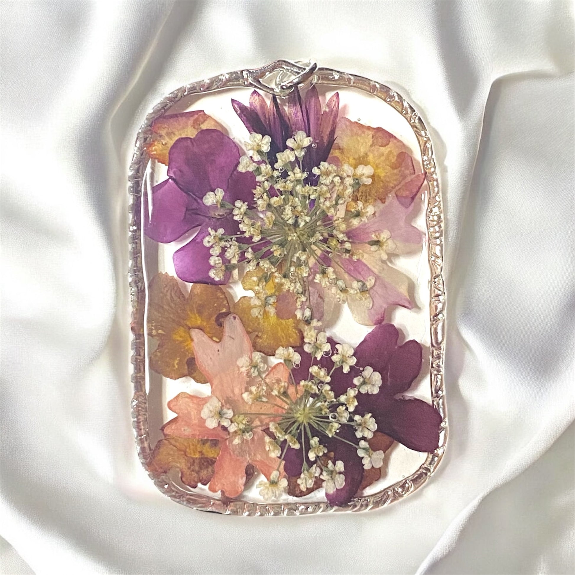 This is a handmade necklace made with real dry pressed flowers. The bezel is made of silver colored alloy. The bezel is attached to a 925 sterling silver chain. Each piece of jewelry is unique and hand made.