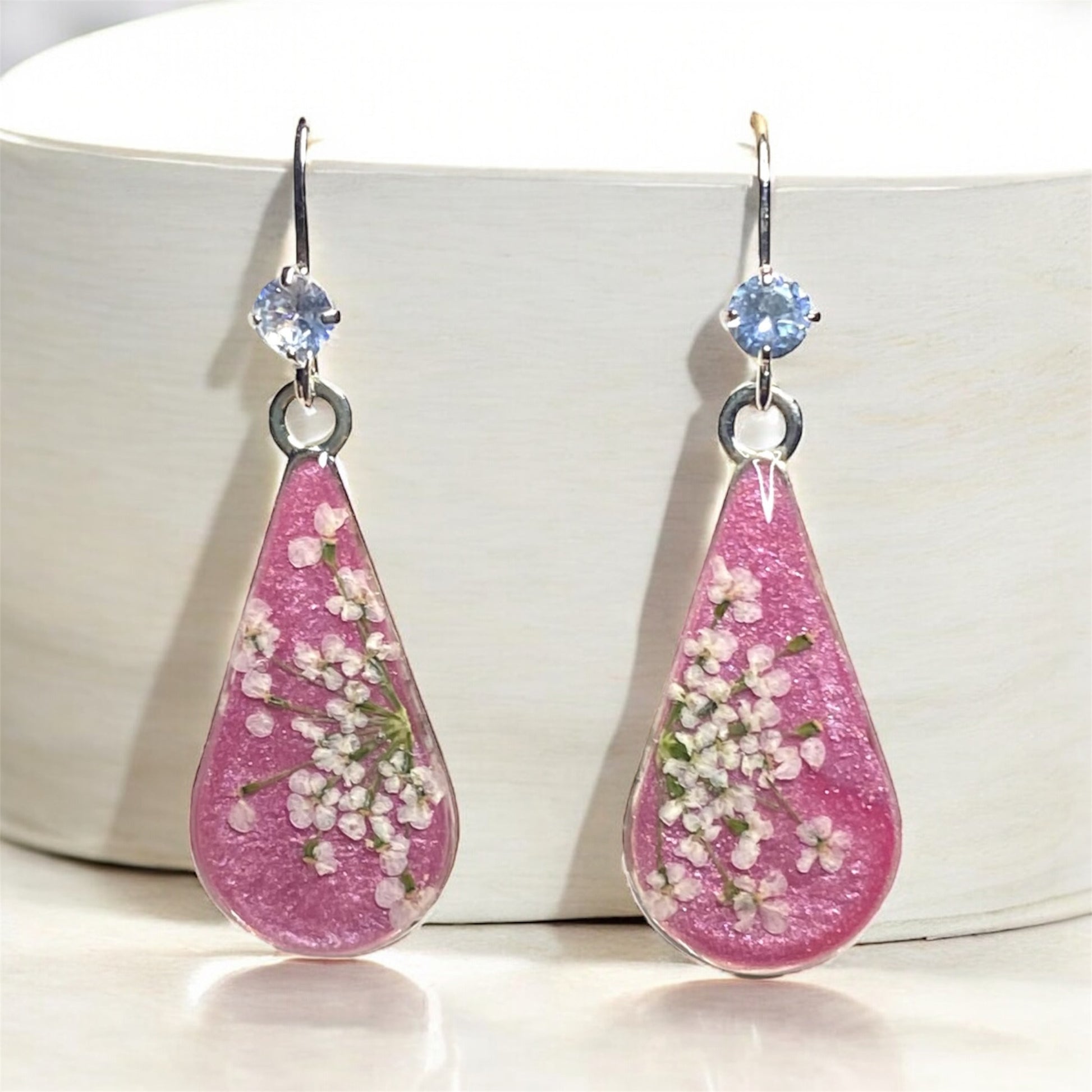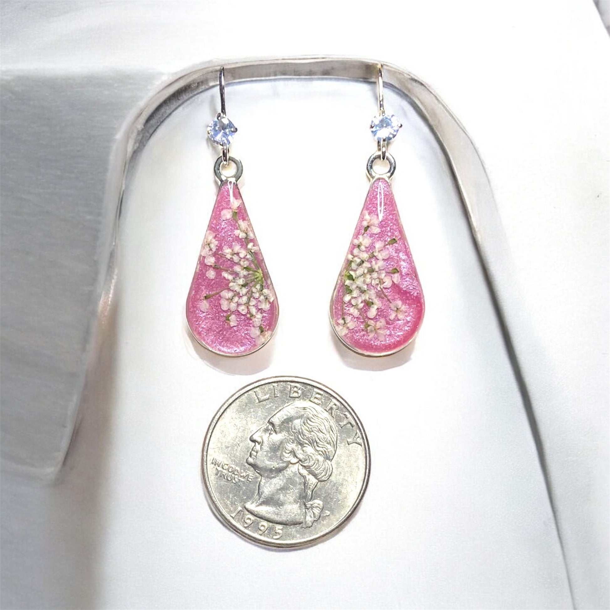 These are resin earrings with dry pressed flowers. The bezels are Silver colored alloy. They are super thin, light weight, and easy to wear. The earring hooks are made of gold plated brass. They are lead free, cadmium free and nickel free.