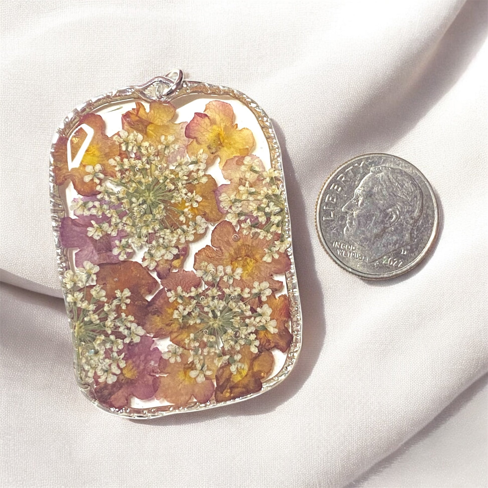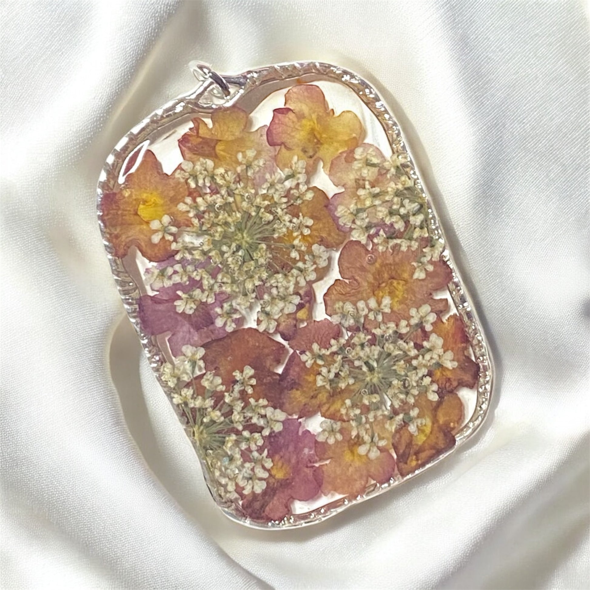 This is a handmade necklace made with real dry pressed flowers. The bezel is made of silver colored alloy. The bezel is attached to a 925 sterling silver chain. Each piece of jewelry is unique and hand made.
