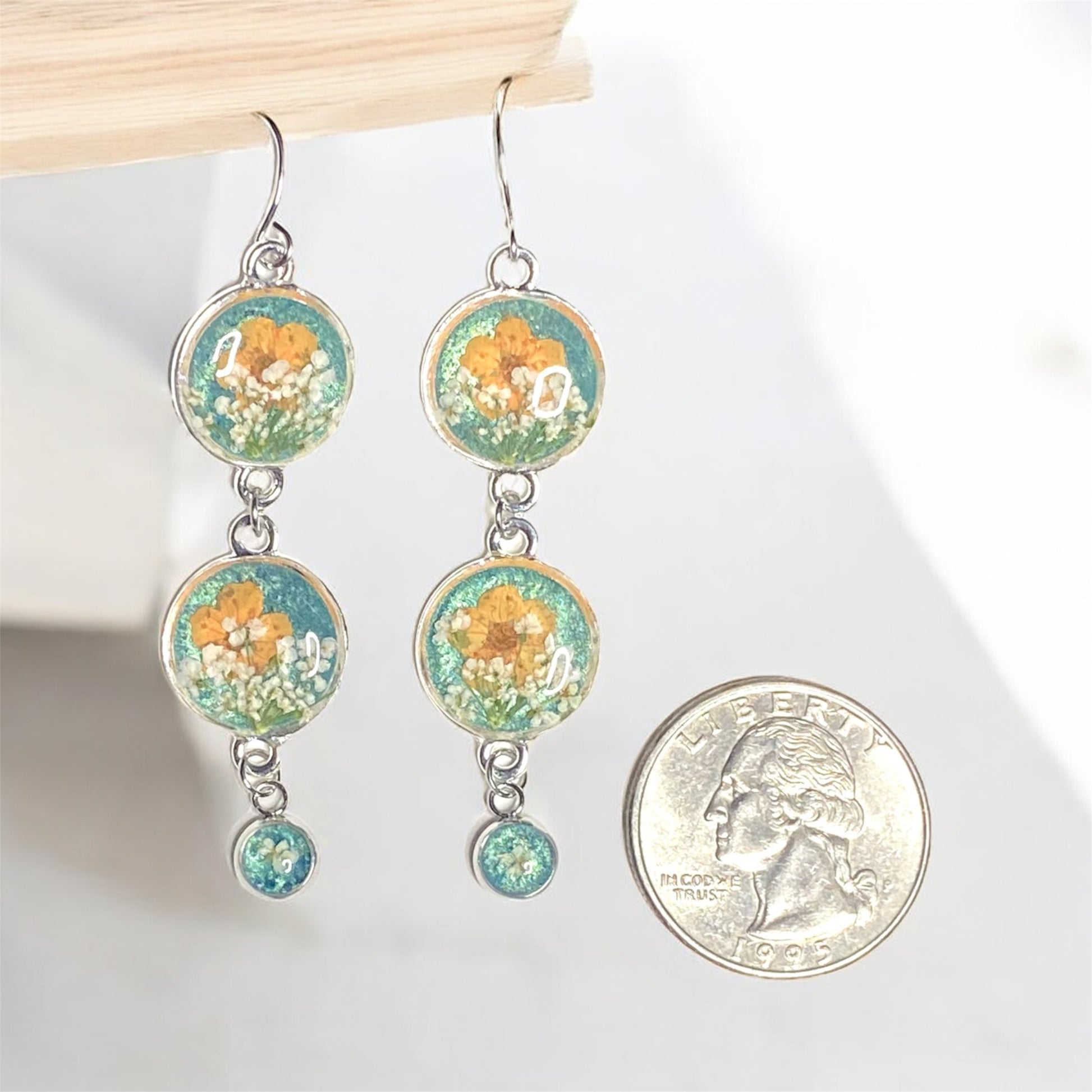Teal Colored Mica Powder Dangle Earrings with Orange Plum Blossoms and Queen Anne’s Lace