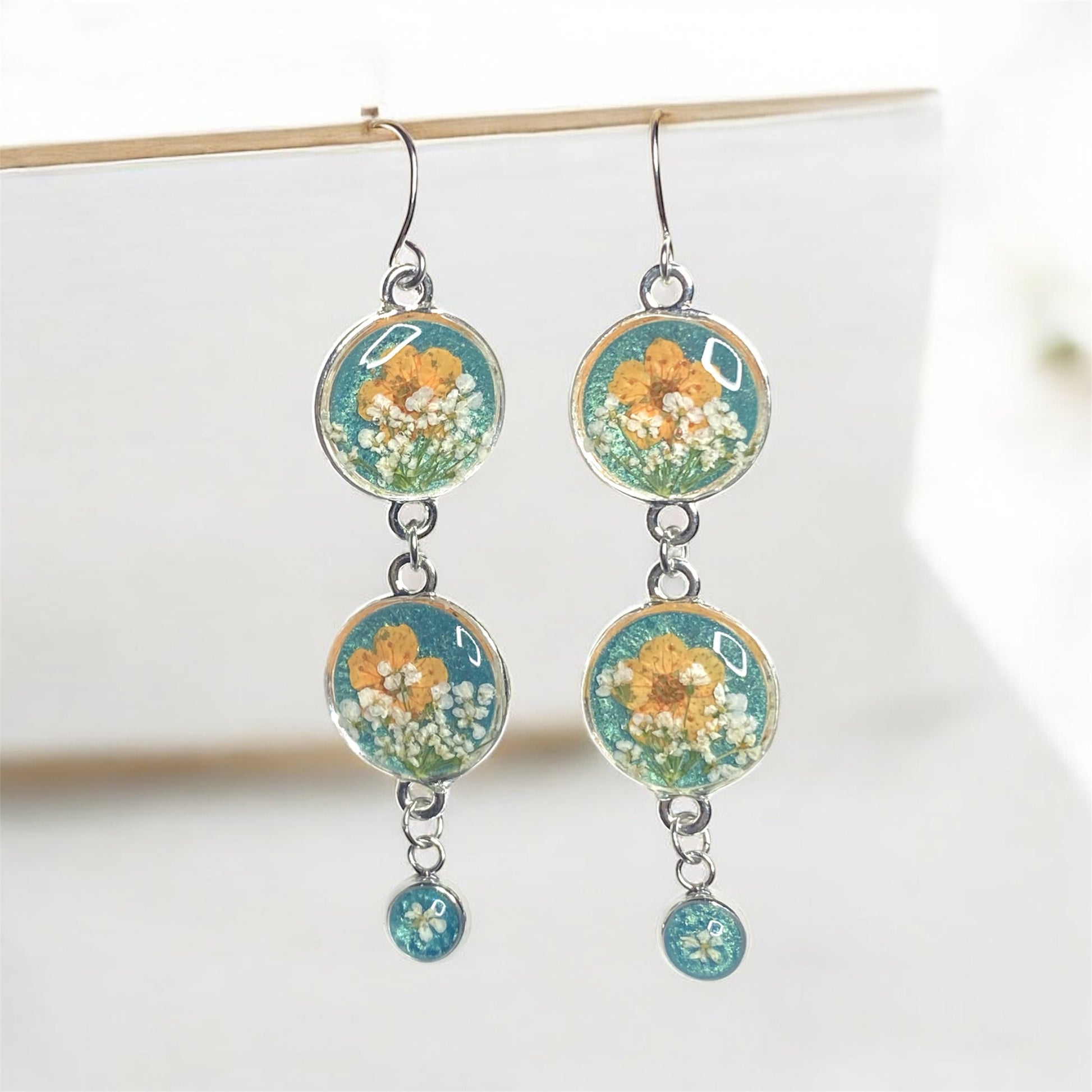 Bring a touch of nature’s beauty wherever you go with these handcrafted dangle earrings. Each piece features real pressed flowers encased in clear resin, preserving their vibrant petals. The triple-drop design creates graceful movement, with silver-toned bezels that add a modern yet timeless touch. Lightweight and eye-catching, these earrings are perfect for everyday wear or as a unique statement piece for special occasions.