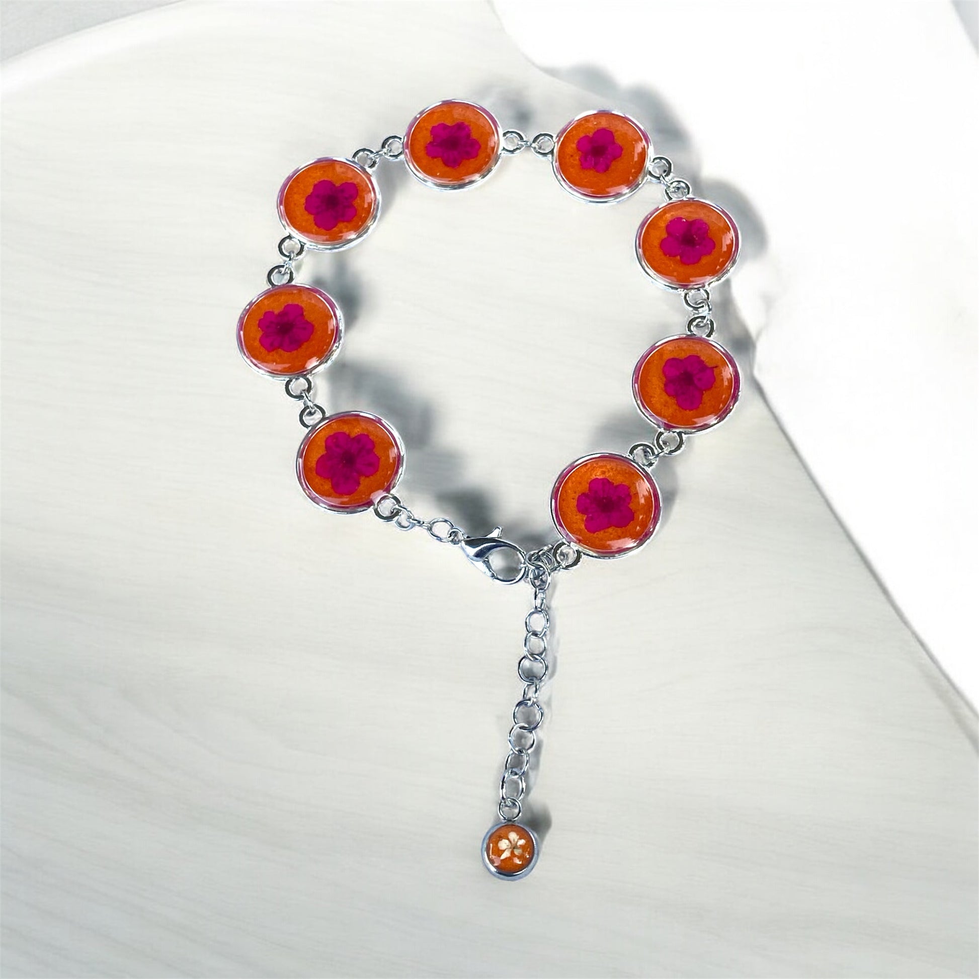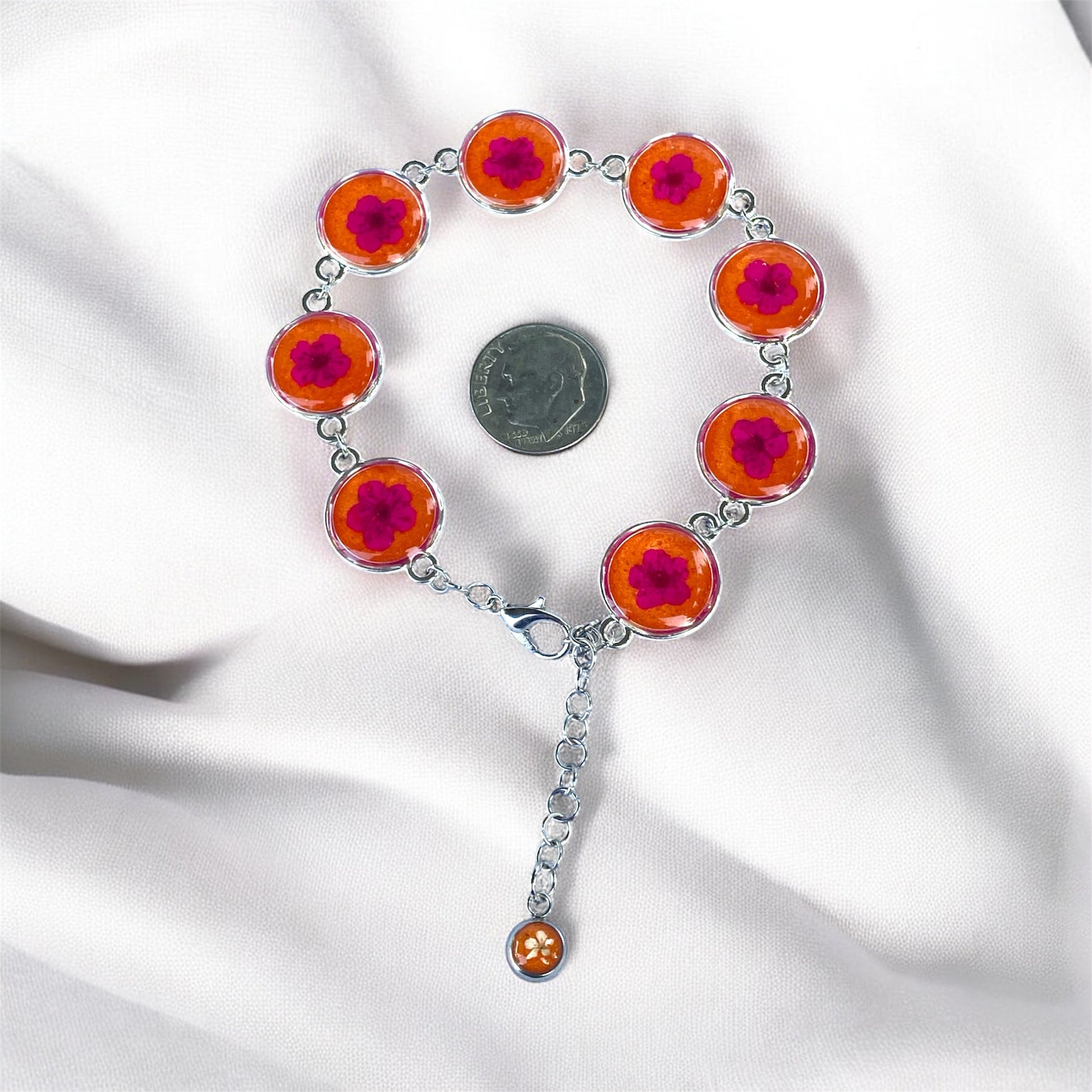 Real dry pressed flower bracelets with Orange colored mica powder with Pink Plum Blossoms. The bezels are circular in shape and made of silver colored alloy. They are super thin, light weight, and easy to wear. The chain length stretched out is about 9.5” The chain is adjustable to fit both small and large wrists with a floral charm to hang off the chain. Chain is made of stainless steel jump rings.