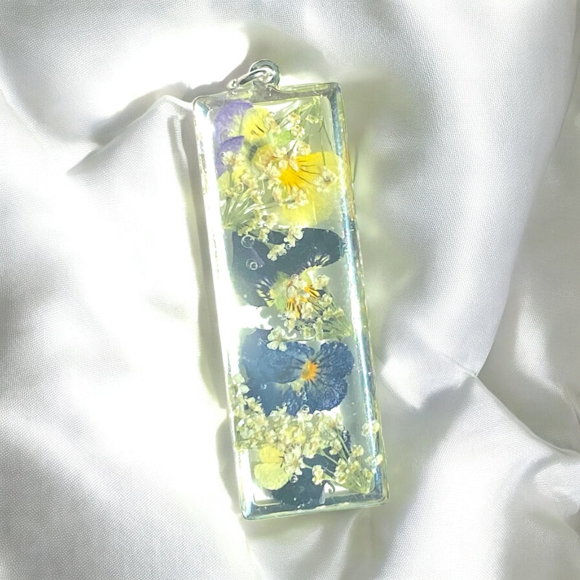 Yellow, Blue and Purple Pansy Necklace with Queen Anne’s Lace